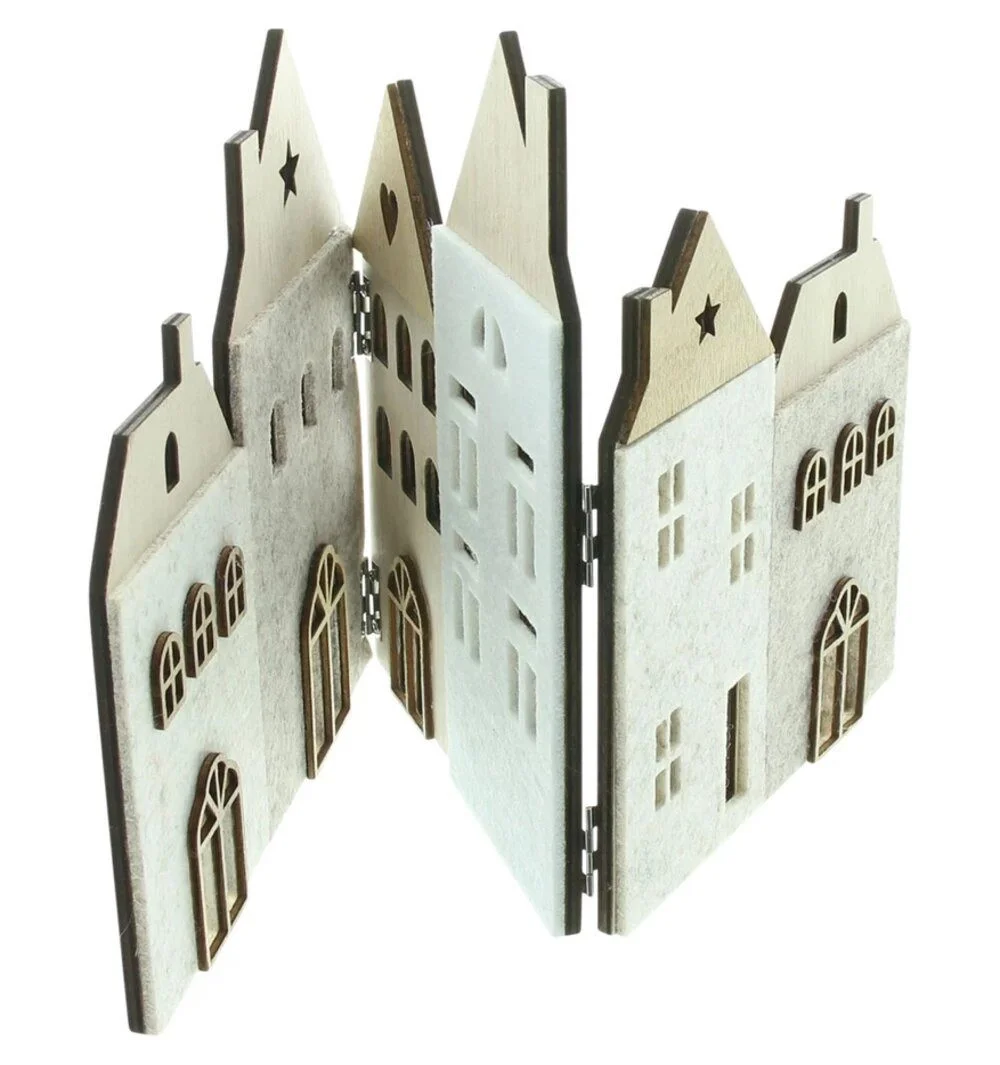 Highlights: Aufklappbares Design · Detailreiche Fenster · Filzverzierungen · Vielseitig dekorierbar · Perfekt für Regale, Fensterbänke & Sideboards.