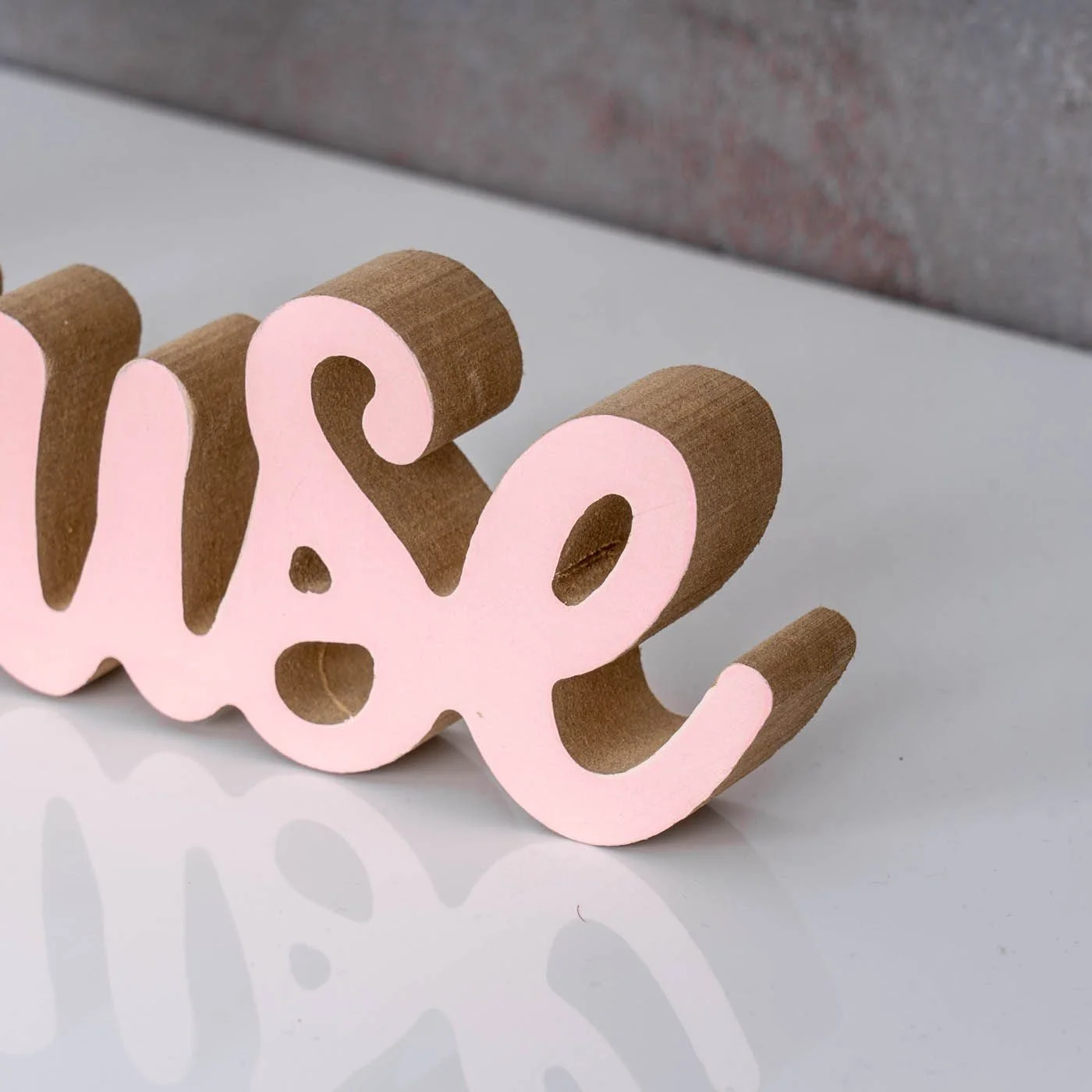 Dieser dekorative Schriftzug bringt eine warme, persönliche Note in jeden Raum. Mit seinem natürlichen MDF-Holzton, kombiniert mit zartem Pastellrosa, eignet sich der Aufsteller ideal für Wohnräume, Kinderzimmer, Jugendzimmer oder als liebevolle Dekoration im Eingangsbereich.