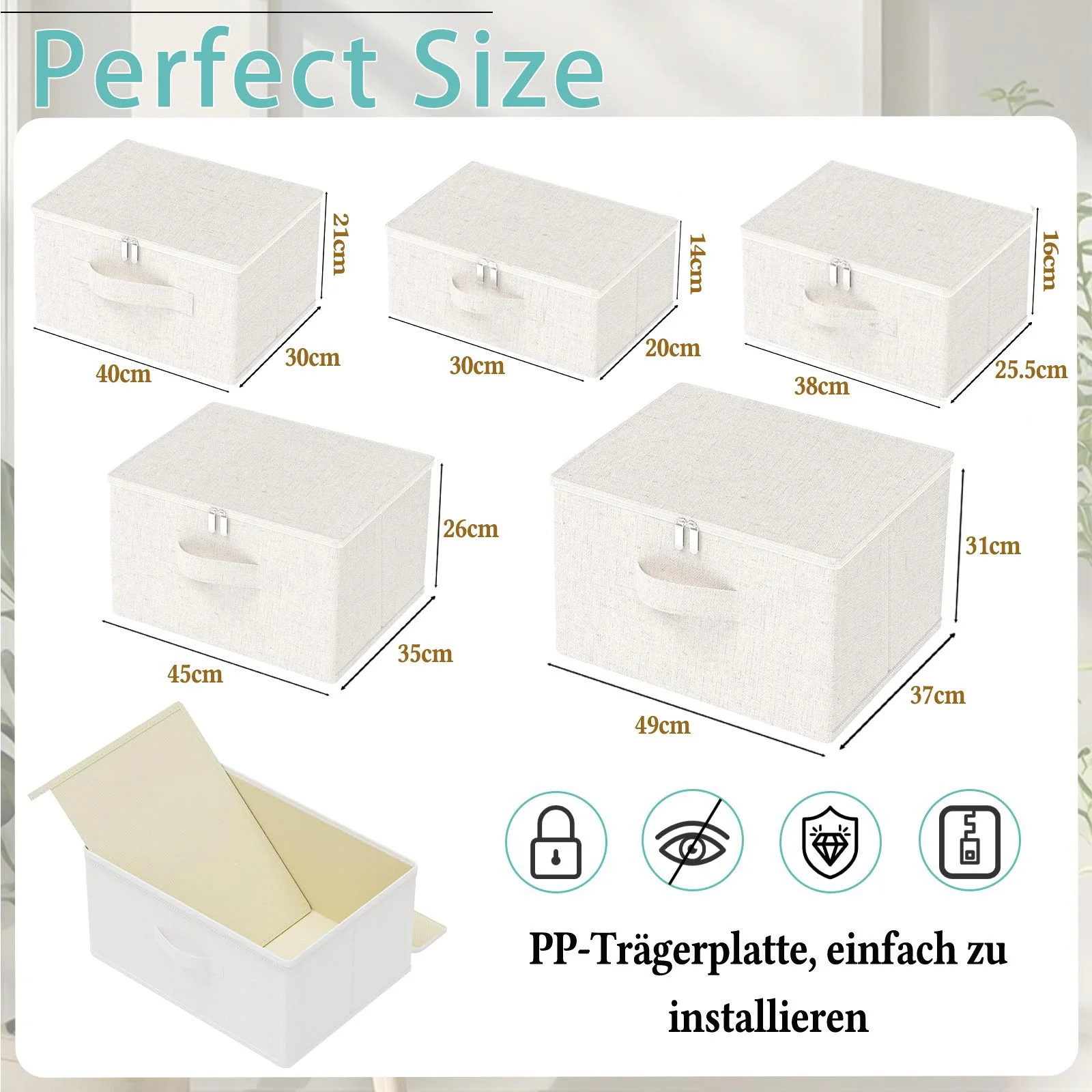 | Im Paket | 1 × faltbare Aufbewahrungsbox mit Deckel (Stoff & PP-Verstärkung) |