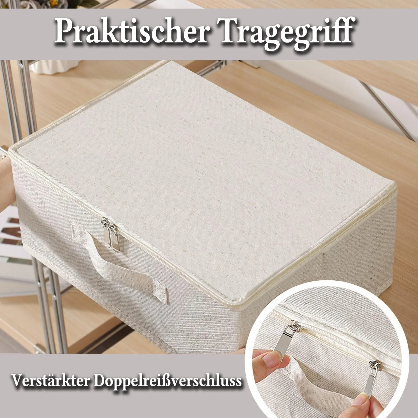 Der praktische Doppelreißverschluss ermöglicht einen schnellen Zugriff, während die seitlichen Griffe das Tragen und Herausschieben erleichtern. Die Box ist faltbar, stapelbar und eignet sich hervorragend für Schränke, Regale, Dachböden oder Schlafzimmer. Der Deckel schützt zuverlässig vor Staub und sorgt dafür, dass der Inhalt sauber bleibt.