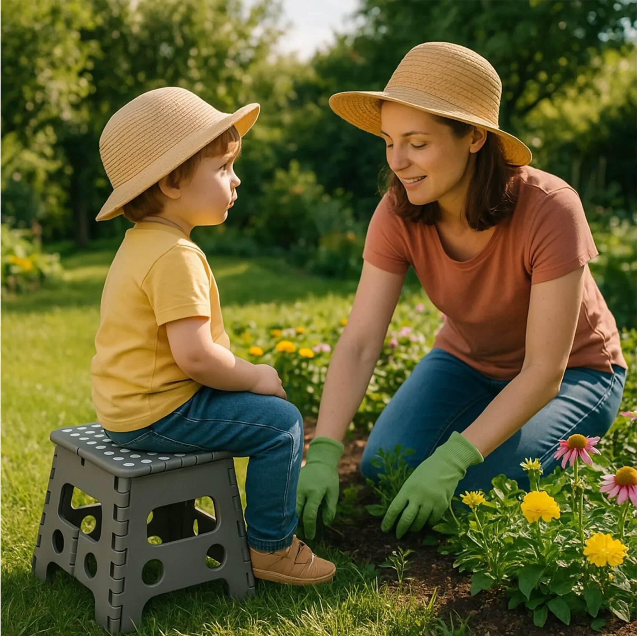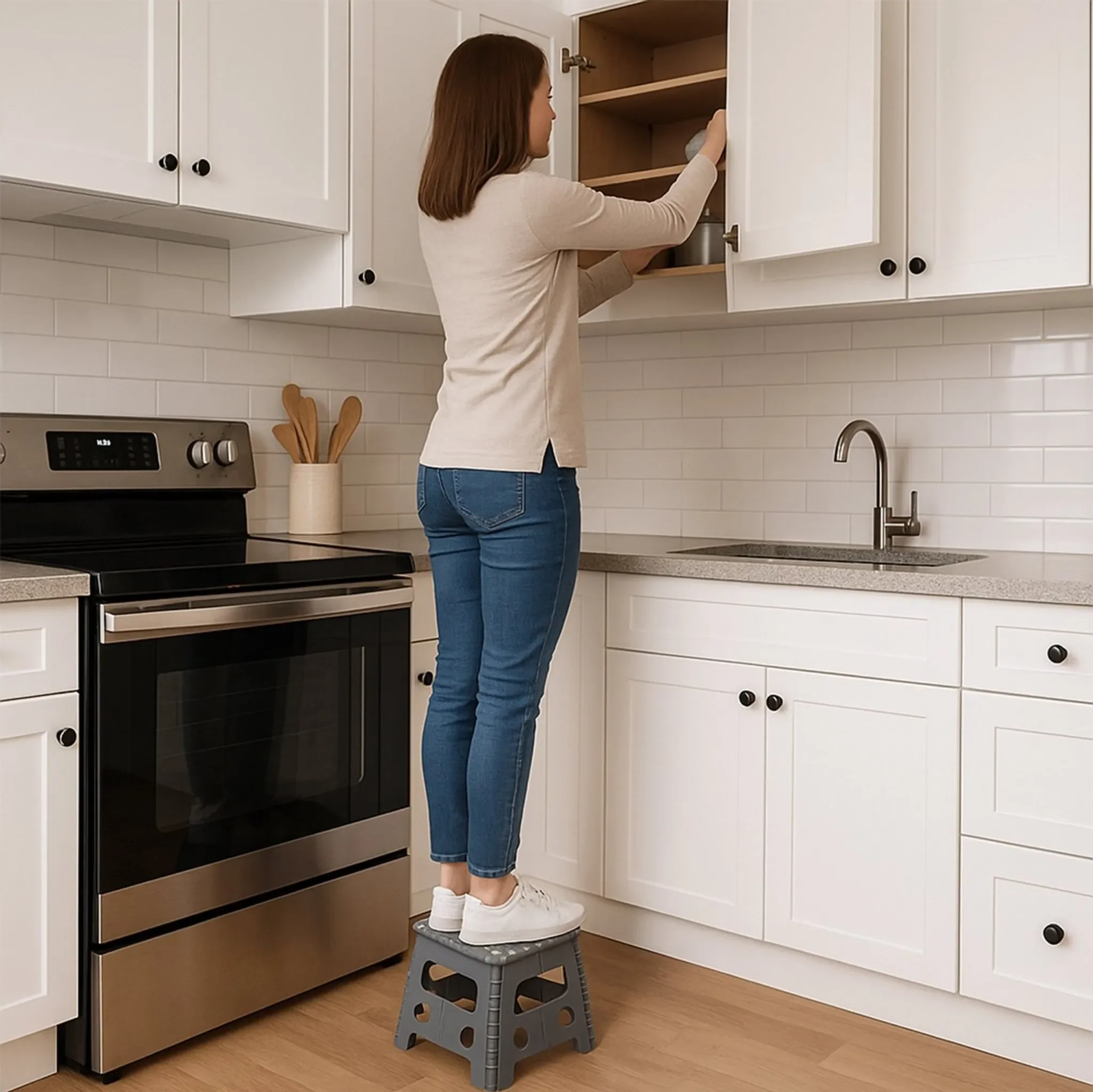 Das rutschfeste Design mit Anti-Rutsch-Punkten und Standfüßen sorgt für sicheren Halt auf jedem Untergrund. Durch die klappbare, leichte Bauweise lässt sich der Tritthocker mühelos verstauen und dank des integrierten Griffs bequem transportieren. Perfekt für jeden Raum – sogar im feuchten Badezimmerbereich nutzbar.