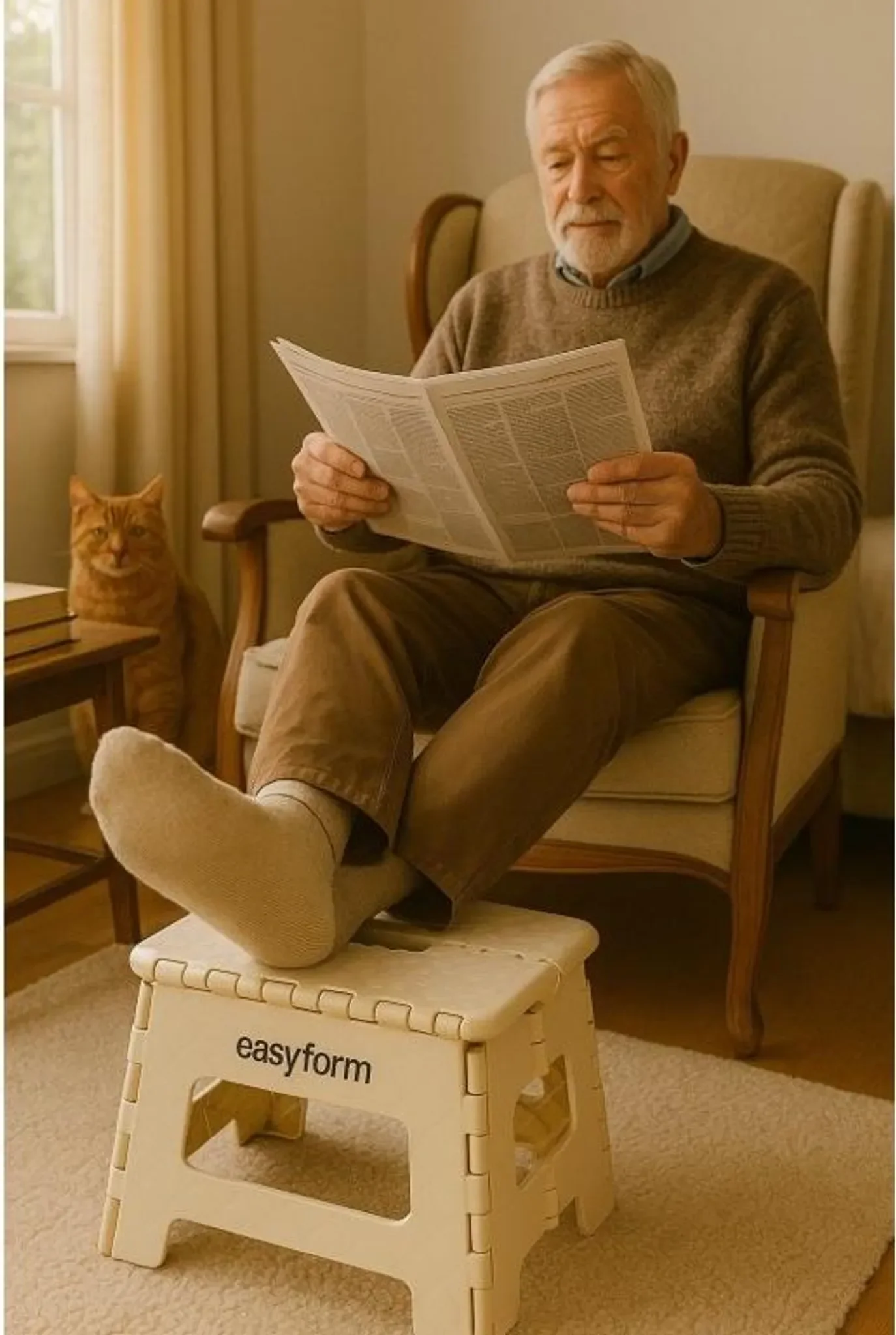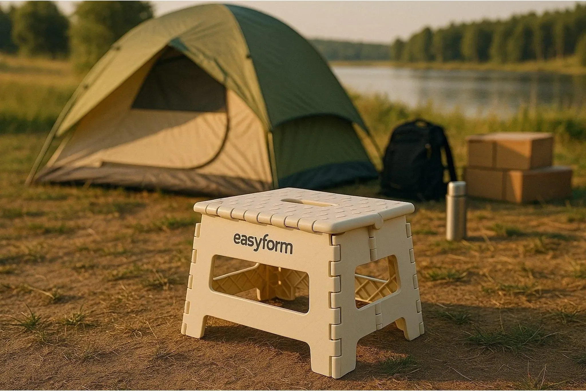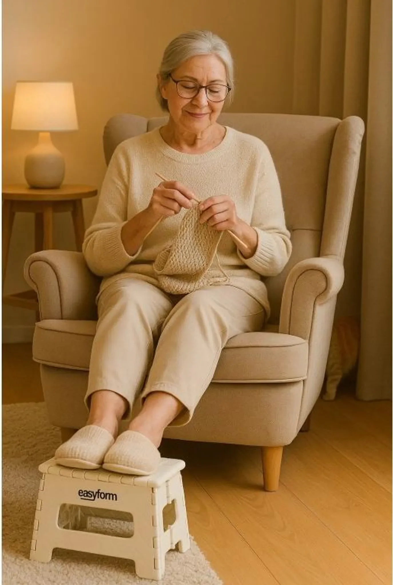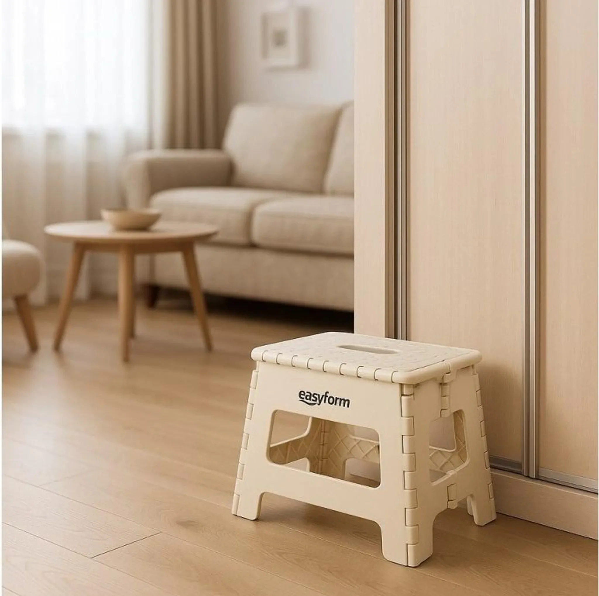 Mit seiner hohen Tragkraft von bis zu 150 kg ist er sowohl für Kinder als auch Erwachsene geeignet. Das klappbare Design sorgt für besonders platzsparende Aufbewahrung – perfekt für kleine Räume. Der integrierte Tragegriff macht den Hocker mobil und jederzeit einsatzbereit.