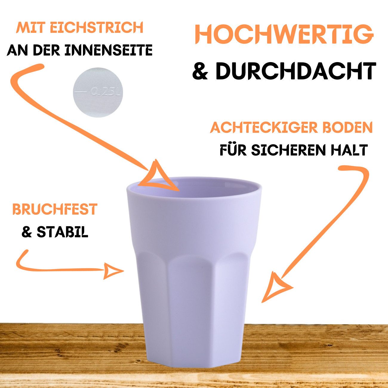Highlights: Pastellfarbenes Design, bruchfest, leicht, stapelbar, BPA-frei, ideal für Getränke aller Art von Wasser bis Cocktails.