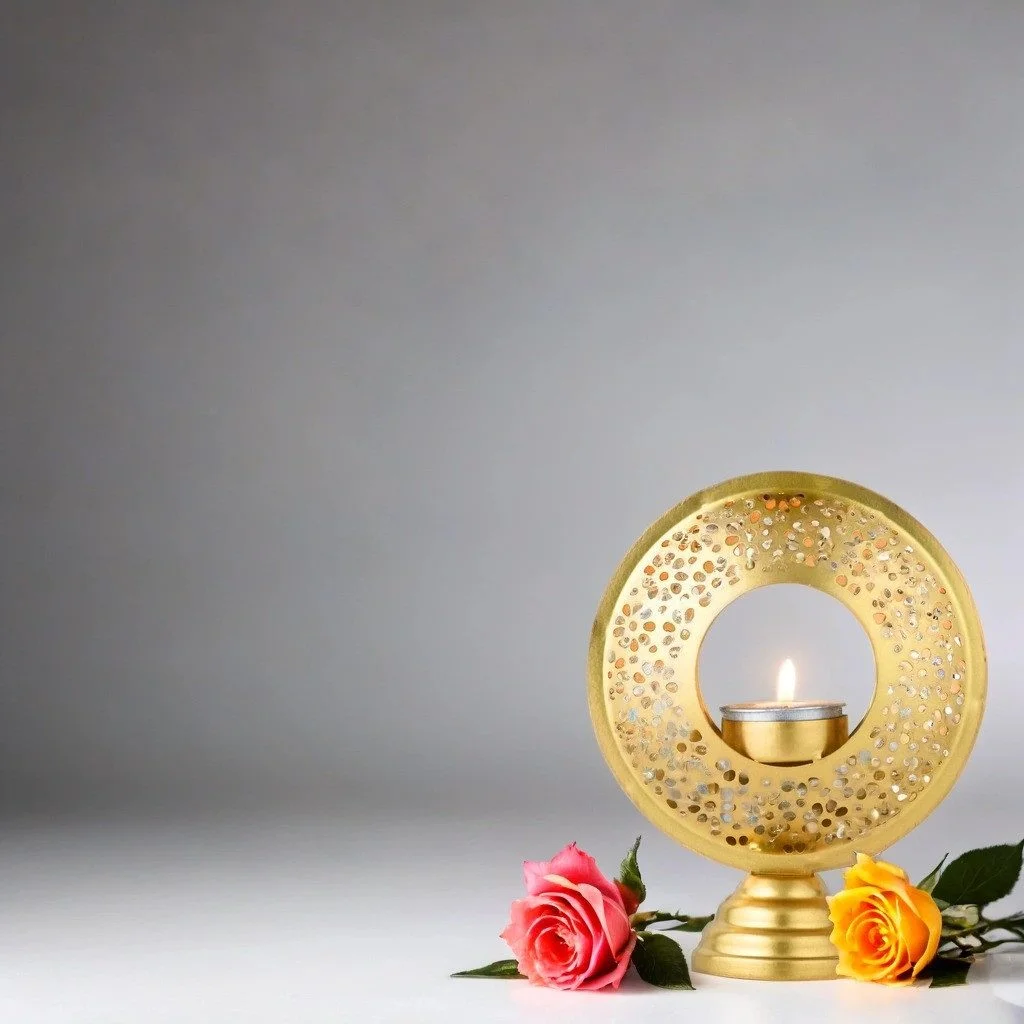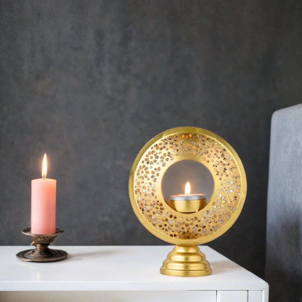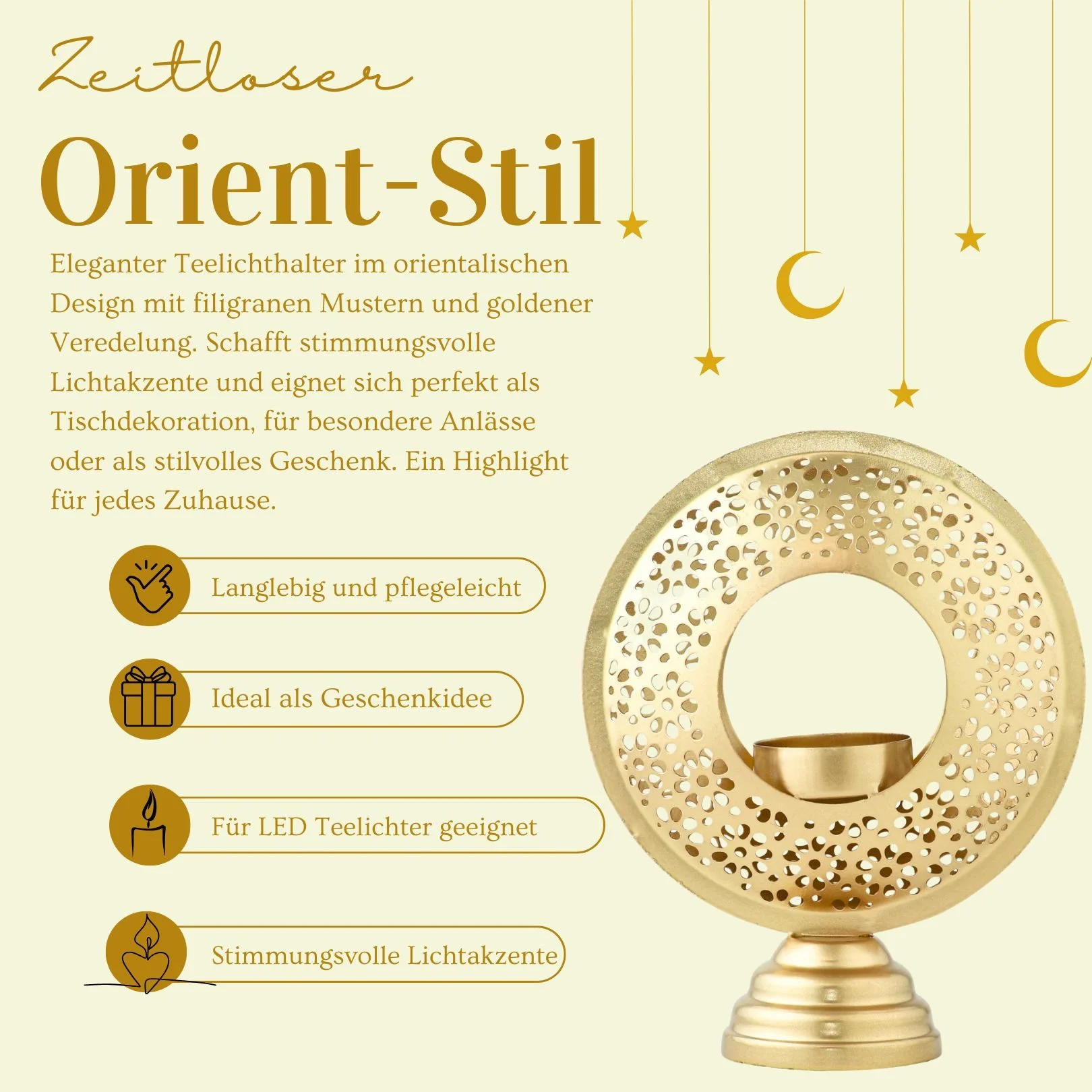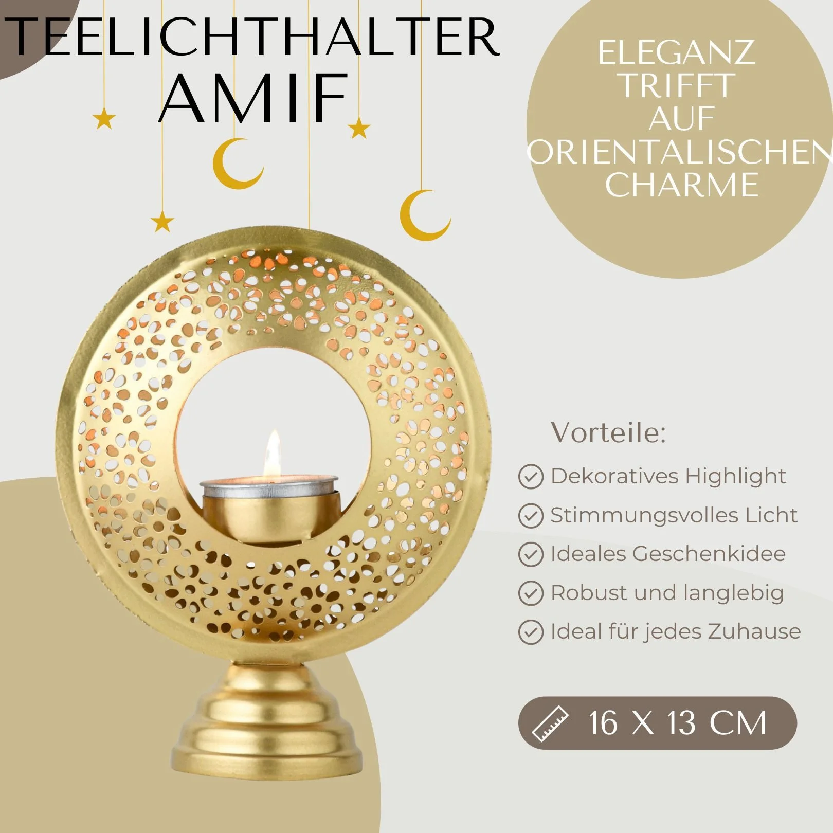 Der elegante Teelichthalter Amif vereint orientalisches Flair mit modernem skandinavischem Design. Außen edel strukturiert, innen goldfarben für warme Lichtreflexe – ideal für Wohnzimmer, Balkon, Terrasse oder romantische Tischdekorationen.