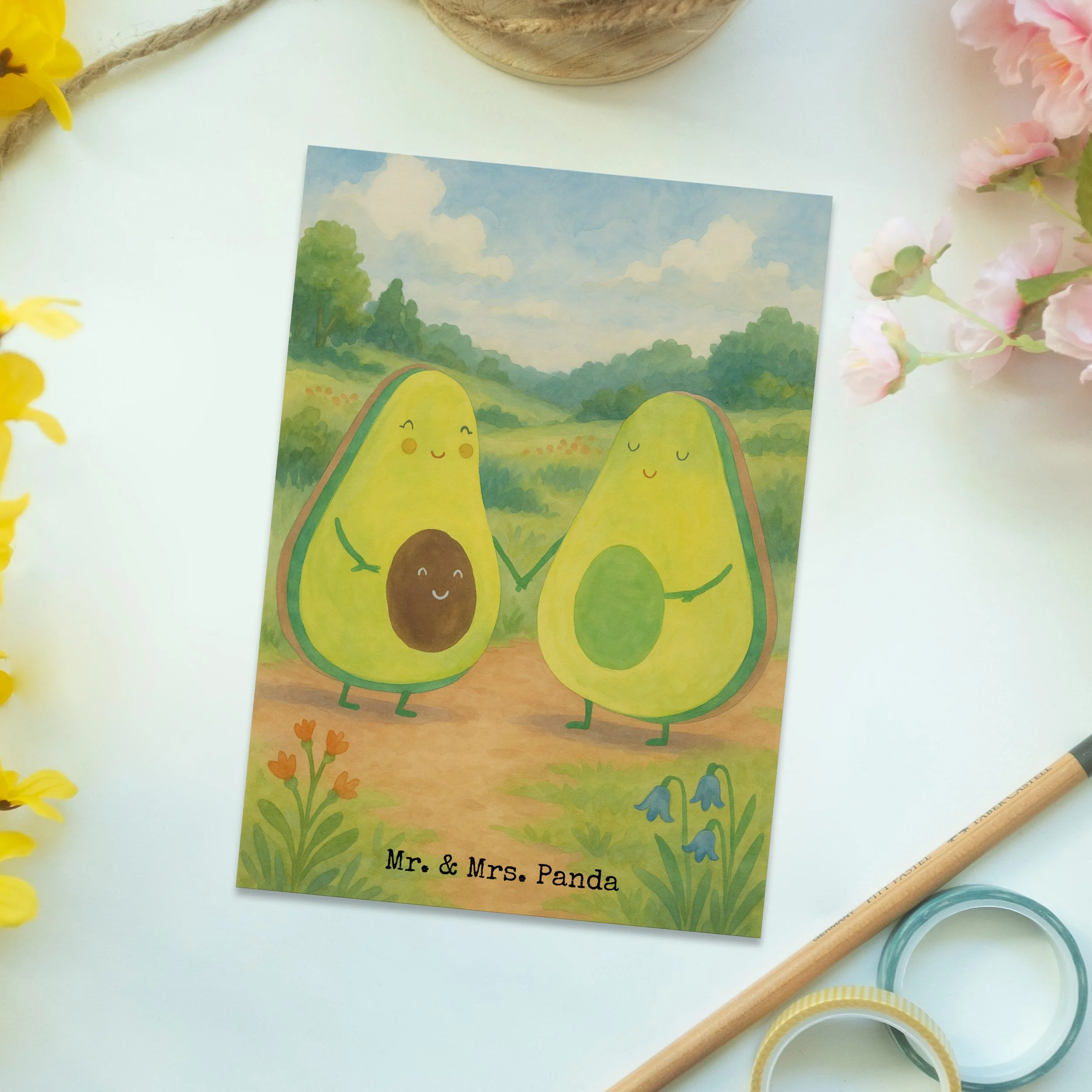 Die Postkarte „Avocado Pärchen“ von Mr. & Mrs. Panda ist ein fröhliches und liebevolles Motiv, perfekt geeignet als Karte für besondere Menschen – ob zur Hochzeit, zur Verlobung, zum Geburtstag oder einfach, um jemandem ein Lächeln zu schenken. Das niedliche Avocado-Paar steht für Liebe, Verbundenheit und gute Laune.