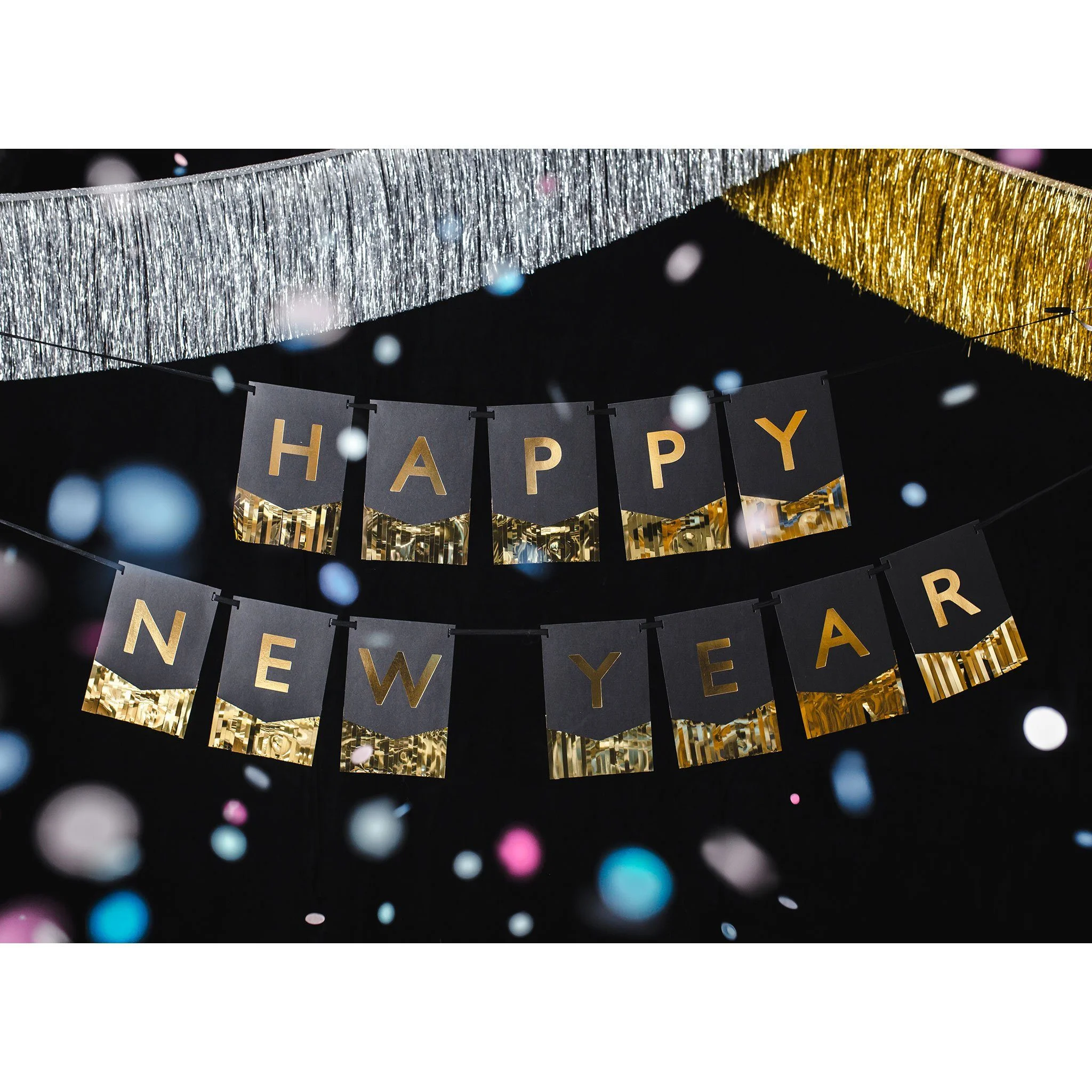 Elegante Happy New Year Girlande in Schwarz und Gold – der perfekte Blickfang für jede Silvesterparty. Der goldene Schriftzug mit glänzenden Fransen sorgt für glamouröse Stimmung und wertet jeden Raum sofort sichtbar auf.