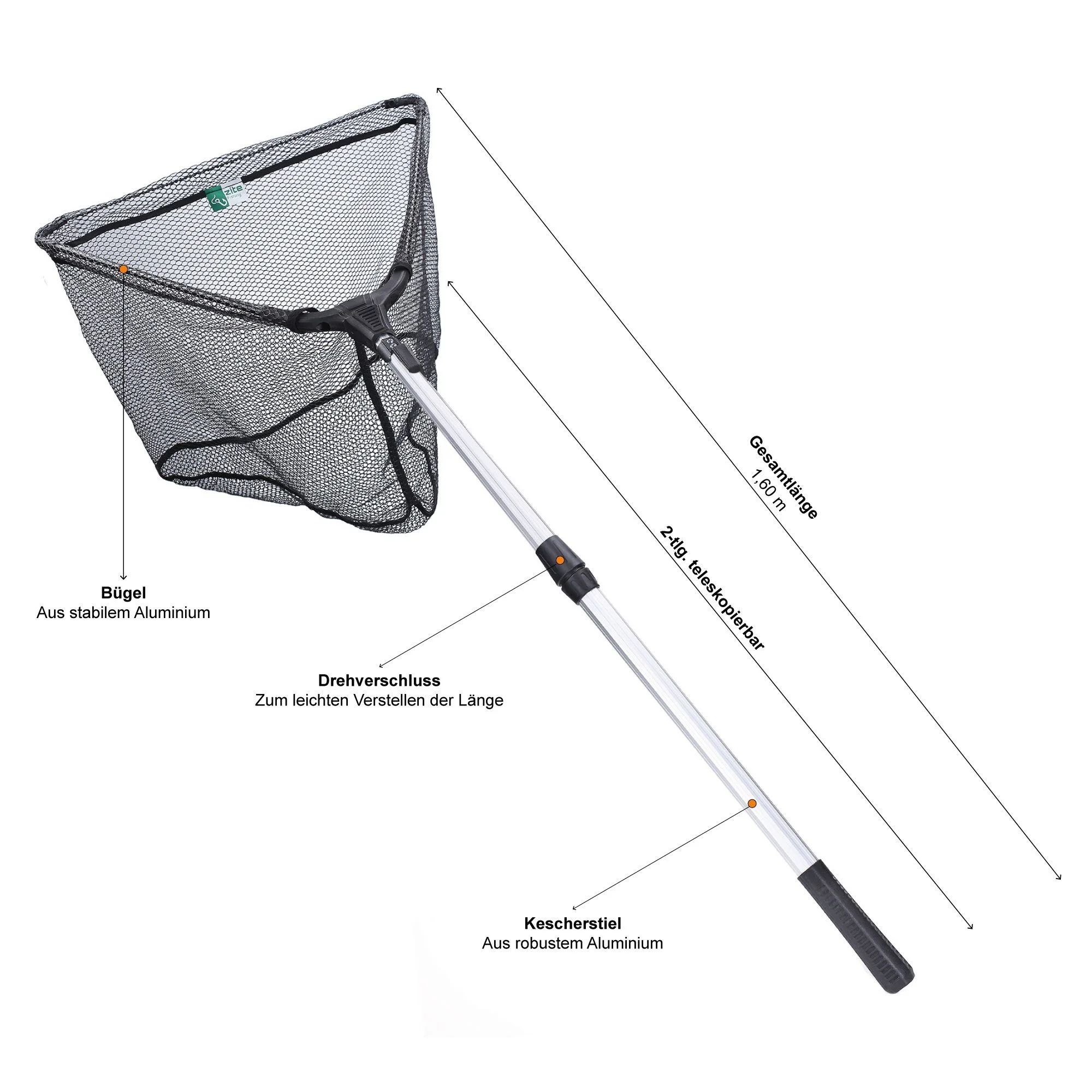 Zite Angelkescher – Gummiert & teleskopierbar, 160 cm mit Maßband-Tasche